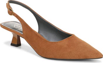 Complete your look with the timelessly classic style of a pointy-toe pump fashioned with a slingback strap and dainty kitten heel.