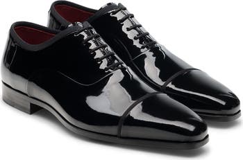 Grosgrain trims highlight the glossy leather upper of an occasion-ready oxford featuring a squared-off cap toe and supportive underfoot cushioning.