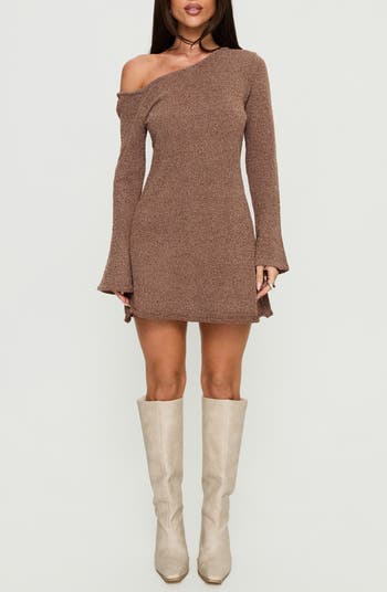 A soft sweater-dress is updated in a leggy length and made in a sweet shoulder-showing silhouette.