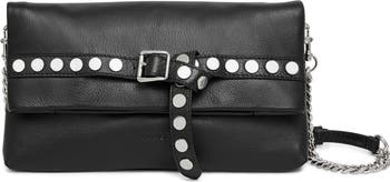 Brushed studs trims the belted front flap on a slender clutch featuring an optional shoulder strap that adjusts for comfortable hands-free wear.