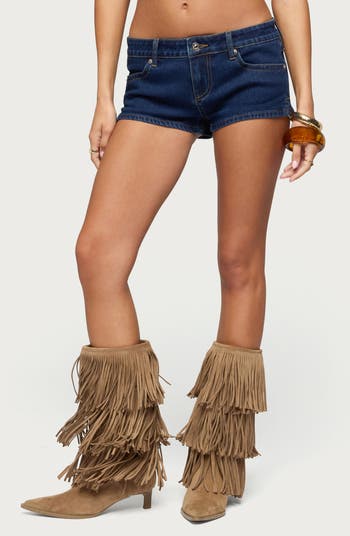 A dark indigo wash enhances the look of these micro shorts cut from stretch denim with a trendy low-rise waist.