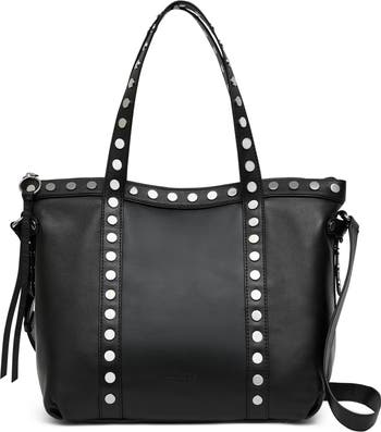 Polished studs and a debossed logo add signature elements to a voluminous tote featuring multiple pockets and an optional crossbody strap for on-the-go convenience.
