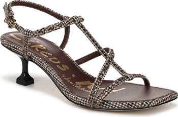 - Adjustable ankle strap with buckle closure; hidden elastic inset