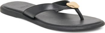 A polished, golden orb tops the toe post of this leather flip-flop crafted with gracefully shaped straps.