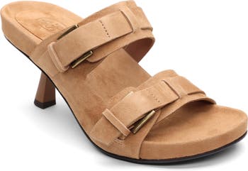 Genuine calf hair brings rich texture to this contemporary slide sandal designed with double buckle straps and set on a tapered heel.