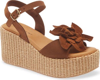 A wrapped platform wedge brings earthy texture and height to a summery sandal embellished with a pretty suede flower.