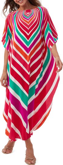 Maxi length caftan dress in a placed print with a boatneck and dolman sleeves