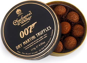 Inspired by 007's cocktail of choice, these dark chocolate truffles feature ganache centers infused with vodka and gin and garnished with a twist of lemon.
