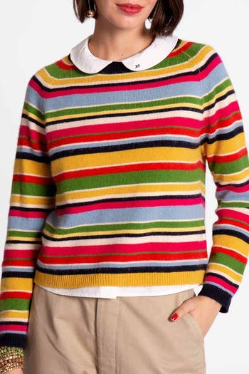 Long-sleeve crewneck top featuring a playful|multi-striped pattern for a fun| vibrant look|Designed for everyday comfort with a classic fit| this colorful piece adds a cheerful|energetic touch to any casual outfit.