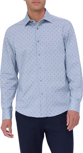An intricate geometric print smartly patterns a sport shirt tailored from breathable, wrinkle-resistant OoohCotton with a smartly pointed collar and cuffs you can button or fasten with your own cuff links. The smooth, double-mercerized knit fabric dries quickly for moisture-managing softness and consistent body temperature.