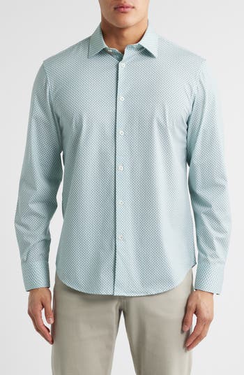 Breathable, wrinkle-resistant fabric offers desk-to-dinner comfort when you add this geometric-print button-up shirt to your weekly rotation.