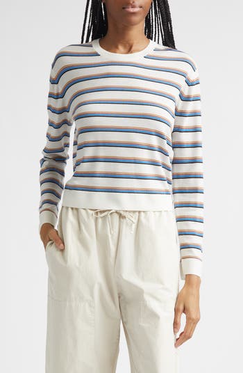 Add a layer of lightweight warmth with a happily striped sweater knit from Italian merino wool.