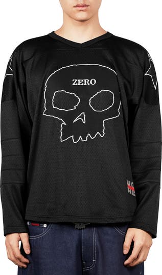 The label draws inspiration from classic hockey aesthetics with this jersey-style top cut from perforated mesh boldly emblazoned with skull-themed varsity graphics.