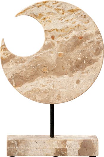 This dramatic sculpture uses cream colored marble to reflect and respect the beauty of celestial objects. The intrinsic veining and shading of the natural stone nods to the rocky formations of our constant companions in the sky. They are sized to make a strong visual impact, and are a wonderful way to add height to any tabletop display. No two will be identical.