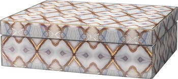 The design of this box is inspired by photos of agate, arranged to evoke the mesmerizing effect of looking through a kaleidoscope. Hand-applied gold leafing enhances the pattern, adding a layer of sophistication and creating a stunning finish. Perfect as a catchall for small items like jewelry or sunglasses, this box combines artistic flair with practical elegance.