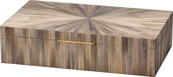 Artisans create the exuberant starbursts on these boxes from thin strips of straw in variegated natural tones. Each opens easily on a quadrant hinge to reveal a generous interior lined with suede fabric. Underneath is a brown suede lining. With its lux interpretation of mid-century design and its decidedly tropical aesthetic, this is refined storage worthy of any treasure that needs to be stylishly stashed.