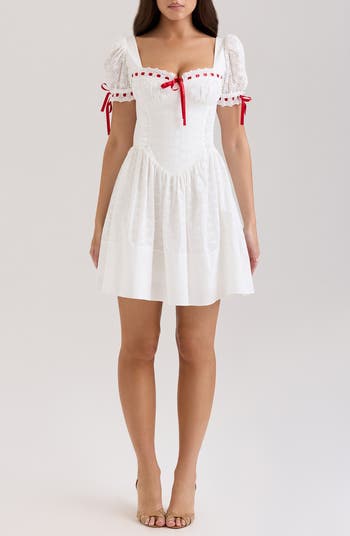 Contrasting satin ribbon stands out along the neck and sleeves of this broderie-anglaise minidress framed by sweet puff sleeves and made with signature corsetry in the bodice.