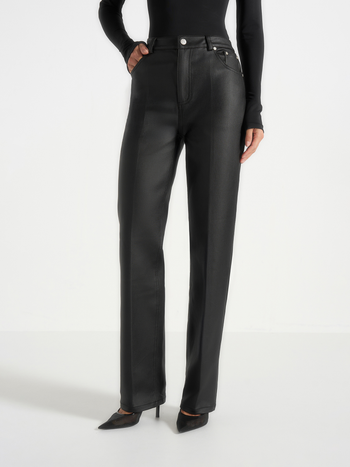 Designed in wax-coated denim, these jeans offer a structured aesthetic with a contemporary edge. stitching adds clean definition, complemented by hardware for an elevated finish.The adjustable waist tab ensures a customised fit, while functional back pockets provide everyday practicality.