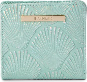 Gleaming logo hardware and seashell-embossed leather add signature appeal to a slim bifold wallet perfect for carrying your cards, cash and coins.
