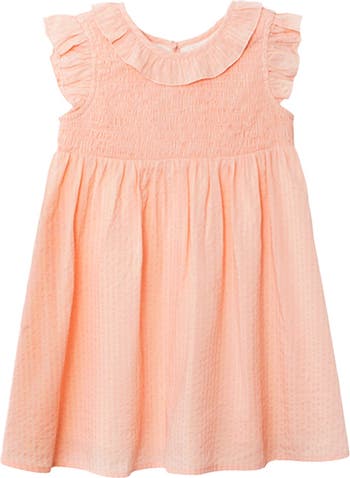 This light and airy sleeveless dress features a smocked bodice and ruffled detailing on the neckline and flutter sleeves. Fabric Care & Content Machine Wash Cold | Line Dry | Do Not Bleach 65% Cotton 35% Viscose Denier lining