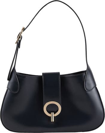 Smooth leather shoulder bag with a signature clasp and a metal buckle handle.
