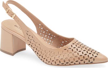 Laser-cut perforations and a pointy toe bring striking dimension to a slingback leather pump grounded by a cushioned footbed and wrapped block heel.