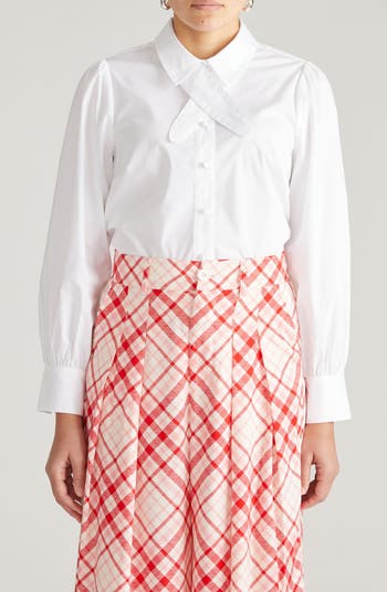 Cut from crisp cotton-blend stretch poplin, this button-up is upstyled with a tie detail at the spread collar and polished covered buttons.