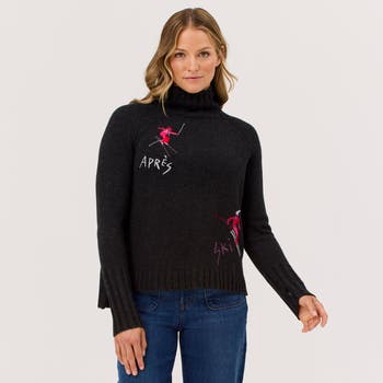 Janica Sweater: embroidered skiers on a soft merino-cashmere blend. Relaxed, boxy fit with thumb holes, warm, breathable, cozy comfort for every day.