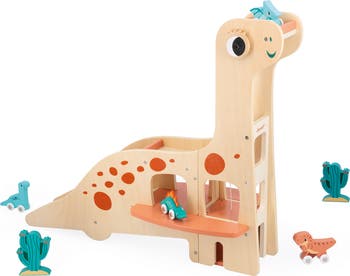 Wheeled dinosaurs zip about on this wooden garage that includes a built-in elevator and a ramp on the tail.