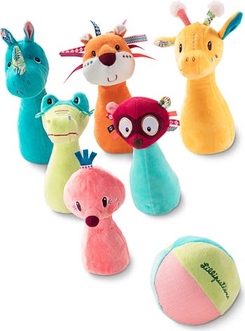 Treat little ones to a bowling experience made just for them with this set of plush critter pins and a soft ball with a rattle inside.