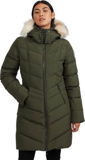 Embrace the beauty of autumn in this chevron quilted puffer with a detachable hood and fake fur trim. Equipped with cozy rib knit storm cuffs and polished combo nylon ciré side panels, this puffer ensures you stay comfortable and stylish all season long. The duck down will keep you warm up to -20°C/ 4°F, while the nylon ciré laminate membrane repels against water and wind penetration to keep you protected against the elements.