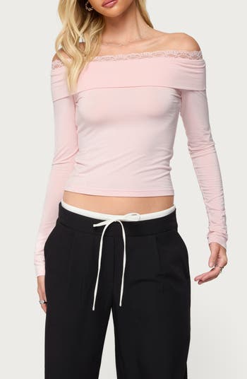 A lacy foldover neckline sweetens this shoulder-baring crop top designed in a stretchy, shapely silhouette that's perfect for date night.