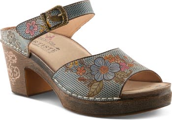 Antique-inspired hardware and hand-painted flowers turn this platform leather sandal into a work of art.