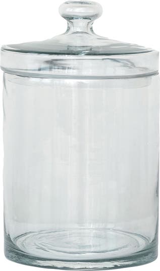 - A timeless clear glass jar with a lid, featuring a simple yet sophisticated round design that exudes vintage charm