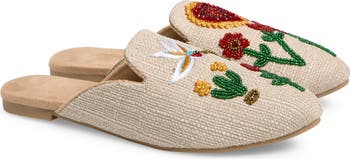 Hand-applied beading and stitched motifs bring intricate detail to this stylish mule creating a richly textured, artisan-inspired finish.