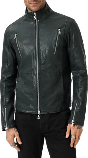 Cut close and paneled for motion, this sheepskin leather jacket balances function and polish with a two-way zip, zipped chest pockets and zip cuffs while set-back hand pockets keep the lines clean.