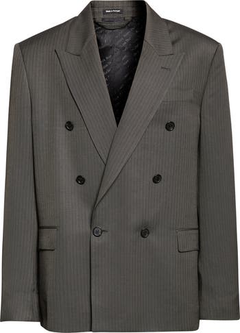 Defined by coordinated contradictions, this double-breasted blazer boasts a suiting fabrication and classic herringbone patterning, all of which are countered by generously cut tailoring for a fluid drape and decidedly relaxed fit.