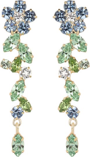 A floral design and colorful Austrian crystals create dynamic drop earrings warmed with 18-karat-gold plating.