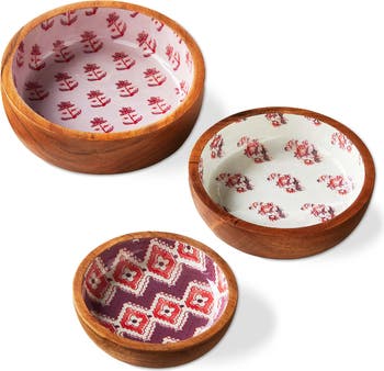 crafted from acacia wood and finished with a colorful enamel design, these bowls are perfect for serving snacks, nibbles, or condiments. the food-safe construction makes them versatile for a variety of uses in the kitchen.