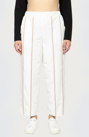 Straight-leg memory taffeta pants featuring a soft cotton lining, an elastic waistband, and binding tape details for a modern, architectural and travel-ready look.