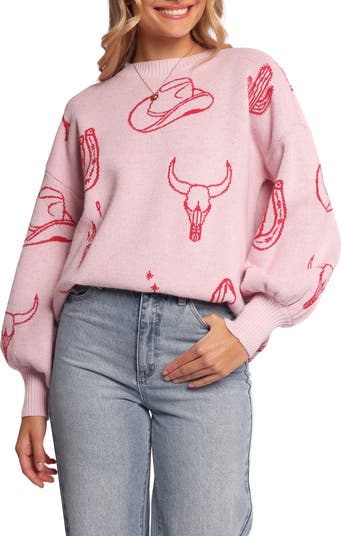 A Western-inspired design adds a playful attitude to this comfy crewneck sweater knit with dropped shoulders for a relaxed fit.