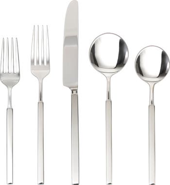 A mirrored and square handles give a modern finishing touch to a striking flatware set crafted of high-grade stainless steel, resulting in a balanced hand feel.
