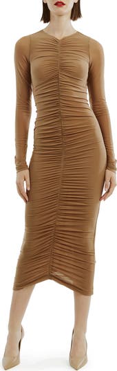 Gathered center seams at the front and back accentuate the body-con silhouette of a mesh midi dress with long sleeves.