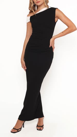 Contrast trim brings defintion to the asymmetric neck on this body-con maxi dress that's ready for a night of cocktails and good seats at the theater.