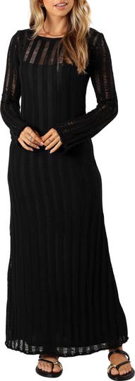 Dramatically elevate your vacation look in this sleek maxi dress with crochet-inspired stripes and sheer panels making it perfect for day and night.