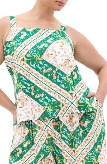 A prairie-inspired scarf design covers this summery tank designed with a sharp squared neckline and adjustable straps.