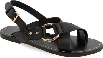 Shiny hardware and wide leather straps shape the sunny-day ready silhouette of this flat slingback sandal.