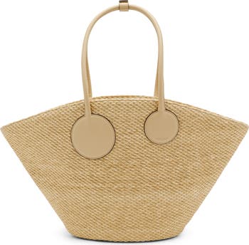Vintage market baskets inspired the sculptural design of this roomy raffia tote topped with rolled handles long enough to slip over the shoulder.