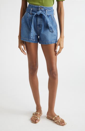 Level up your laid-back look in denim shorts shaped with neat pleats and tied with an optional sash at the widened waist.