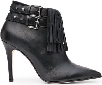 Made from soft Nappa leather, these booties feature a pointed toe, buckles, studs, and fringe for a bold and edgy look. Step up your shoe game and add some serious attitude to any outfit with these statement booties. Bonus - a gold metal toe accent is available on the red bootie.